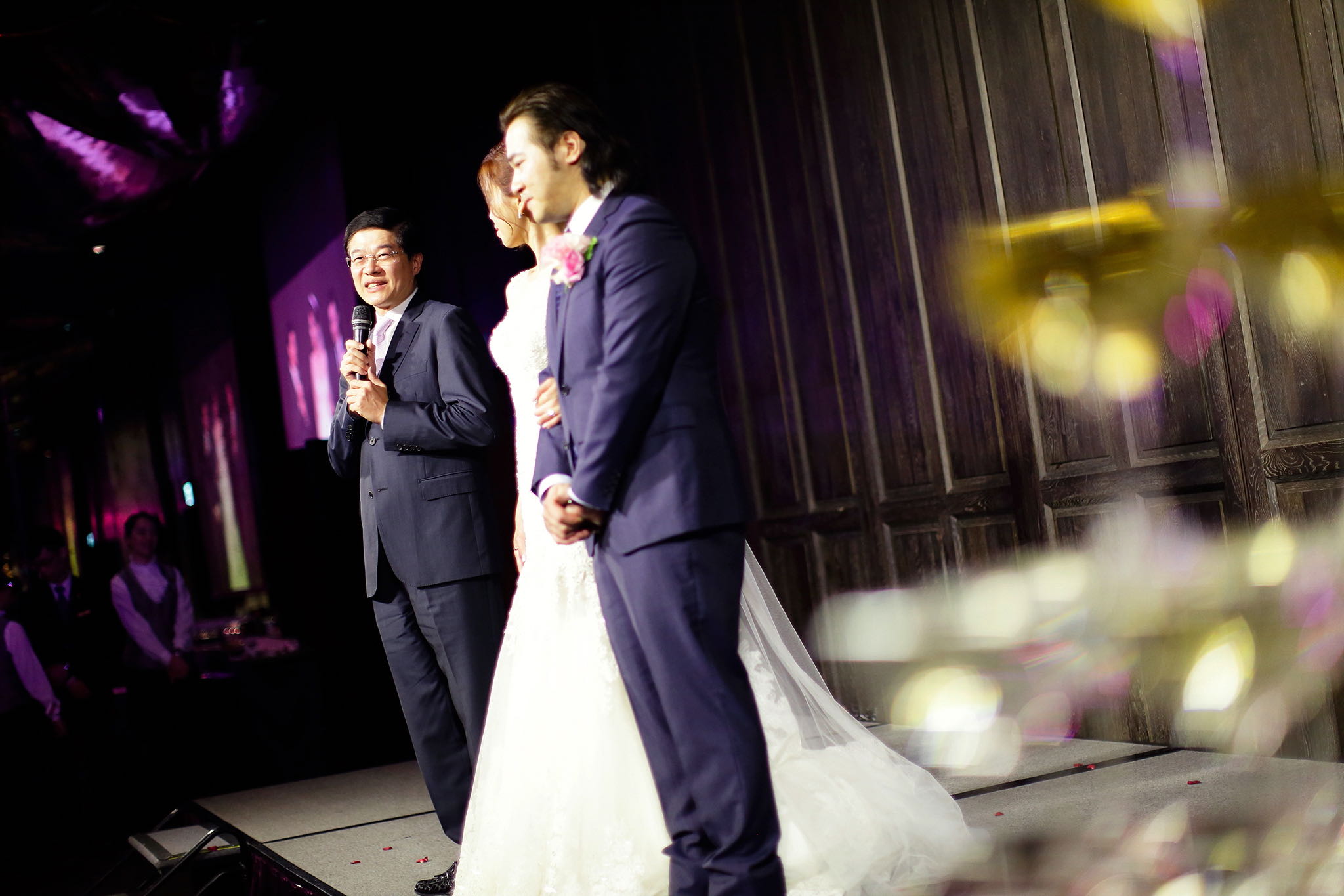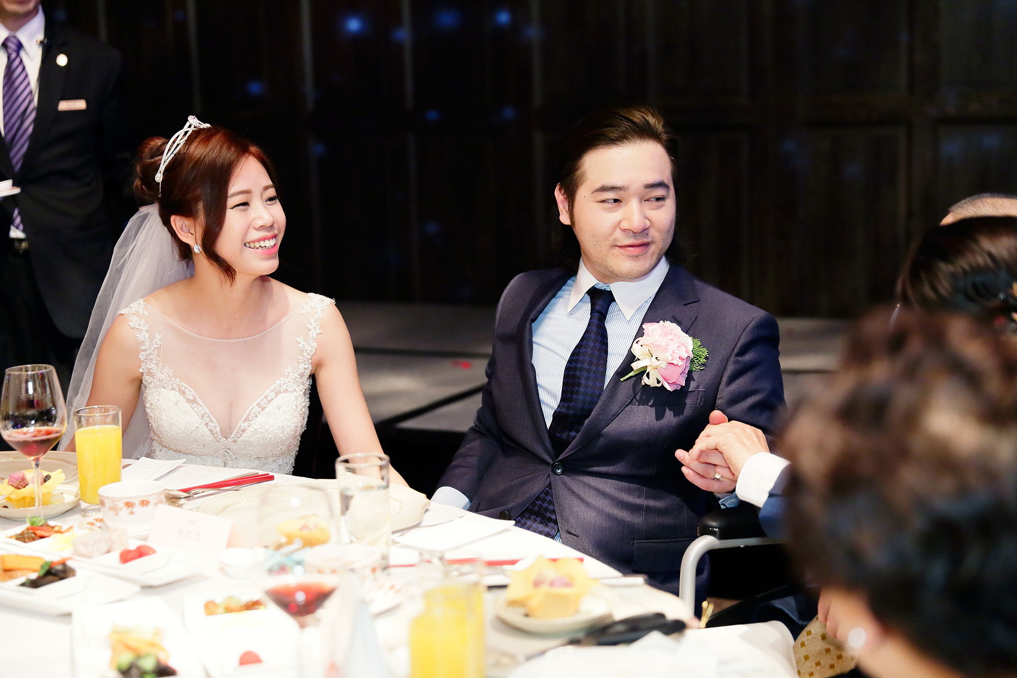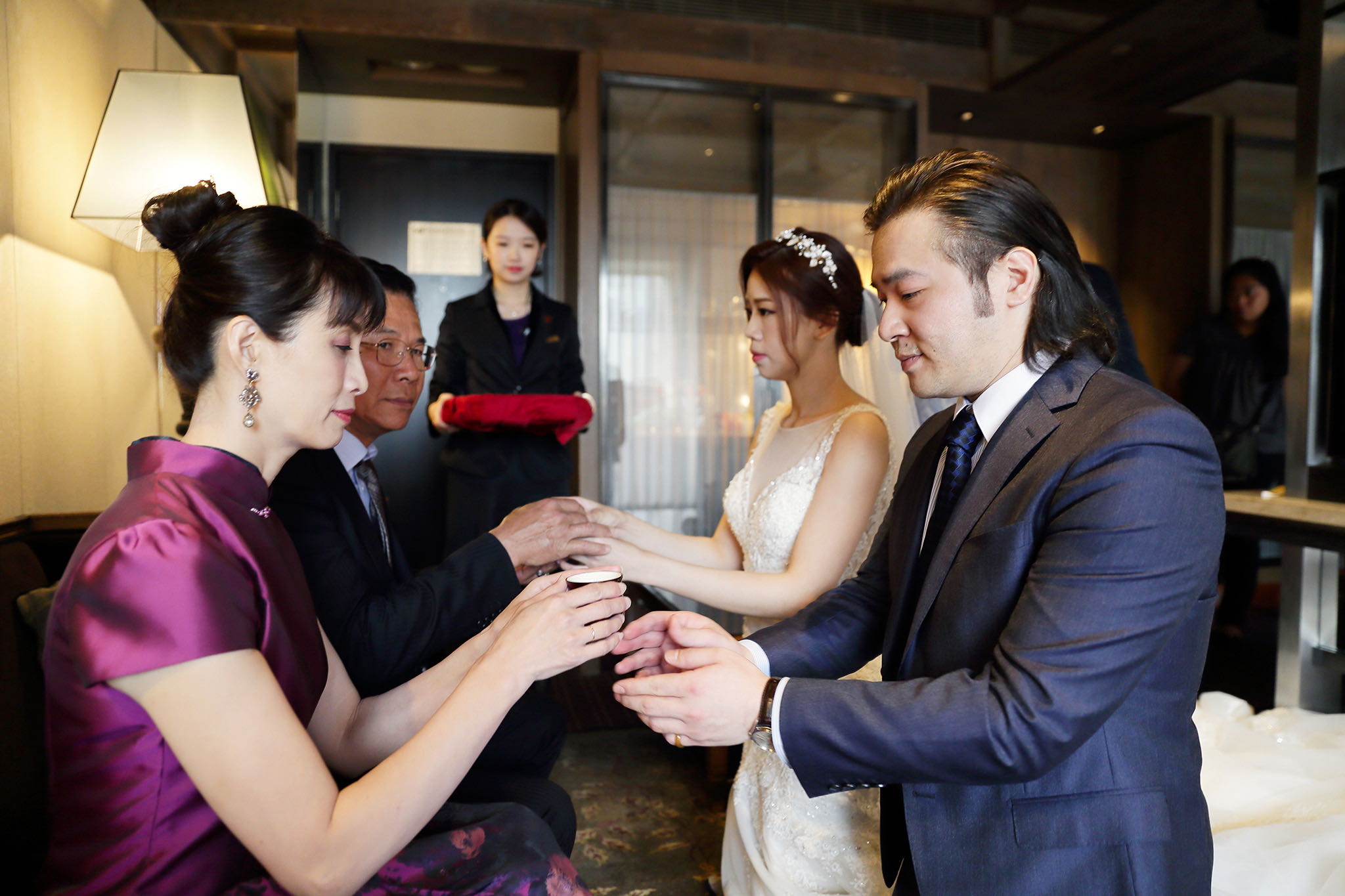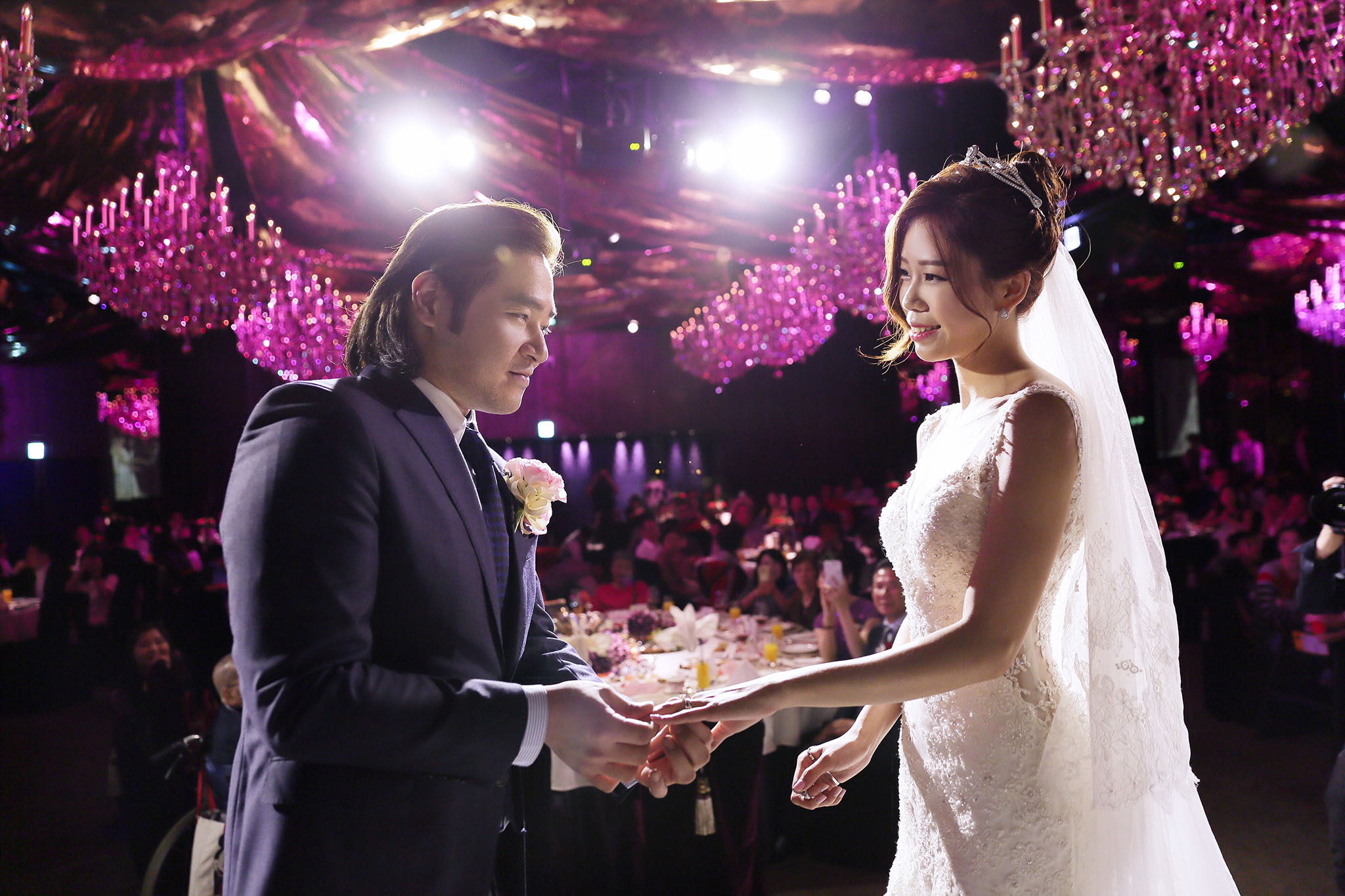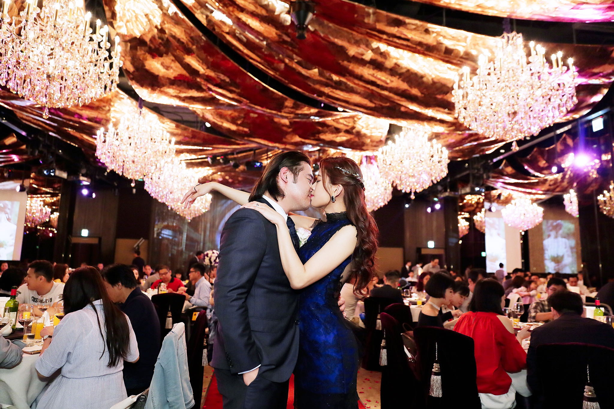 很多新人都會跟我說君品酒店很暗很難拍,但對我而言這裡就是暗的很美,絢麗的吊燈鋪陳出黃金般的高貴,溫潤的木頭擺飾家具與裝潢更襯托不俗的氣質溫暖,一直以來都很喜歡君品給人的感覺,不管是內裝還是服務人員,最貼身的小管家無不細心呵護新人,連工作人員也都照顧到了,拍合照時也會主動幫忙親友拍合照,比較讓攝影師能更專心拍攝,君品不只是一間餐廳,更是一種給人暖心的餐廳