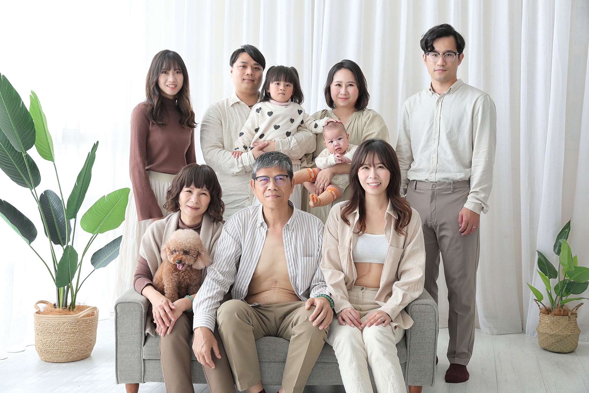 有一天11月的新娘告知我想拍攝全家福時,我當下有點訝異,想說婚禮當天就會拍攝了,應該沒必要再花一次錢,但她告知我因為父親身體的因素,必須做肝臟移植手術,身為女兒鼓起莫大的勇氣,一起動刀捐出自己一部分的肝,來延續父親的身體健康。